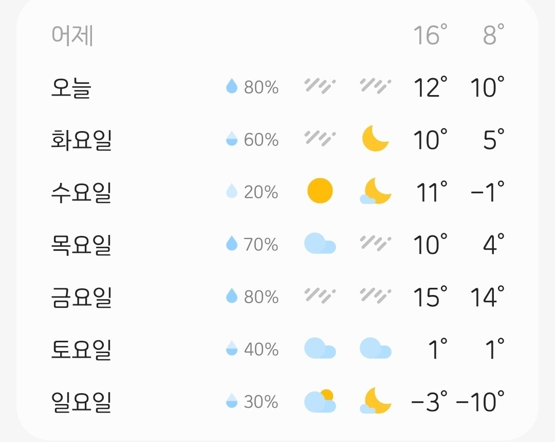 오늘 10일 (화) · 11° · -1° · 0% · 2.6m/s ; 내일 11일 (수) · 12° · 1° · 10% · 1.0m/s
