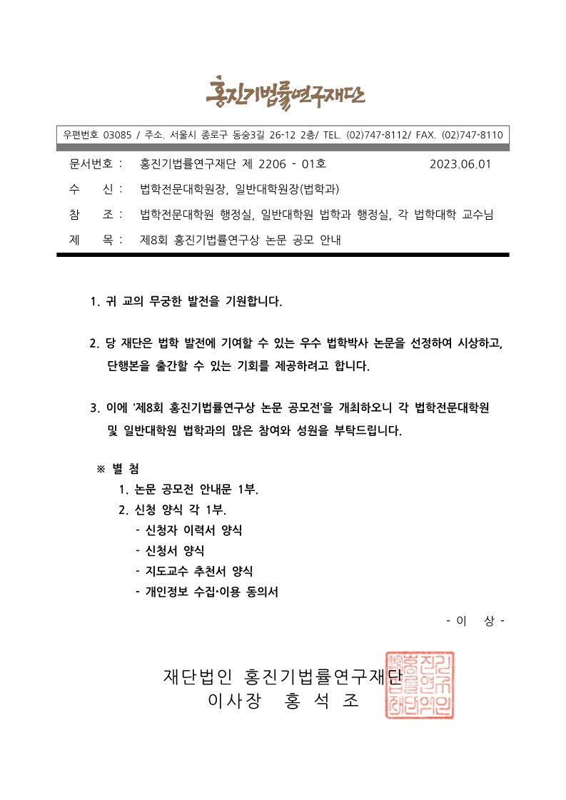 제8회 홍진기법률연구상 논문 공모 안내 | 법학과