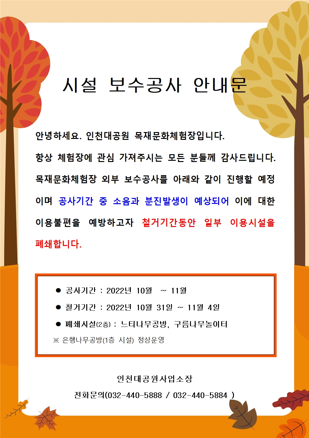 홈>공원 소개>인천대공원>목재문화체험장>소식 > 목재문화체험장 시설 보수공사 안내 | 인천의 공원