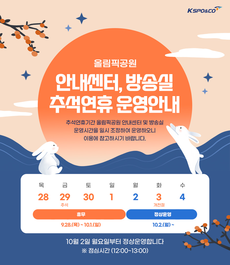 올림픽공원 안내센터, 방송실 추석연휴 운영안내 | 공지사항 | 알림·홍보 | 한국체육산업개발 한국체육산업개발